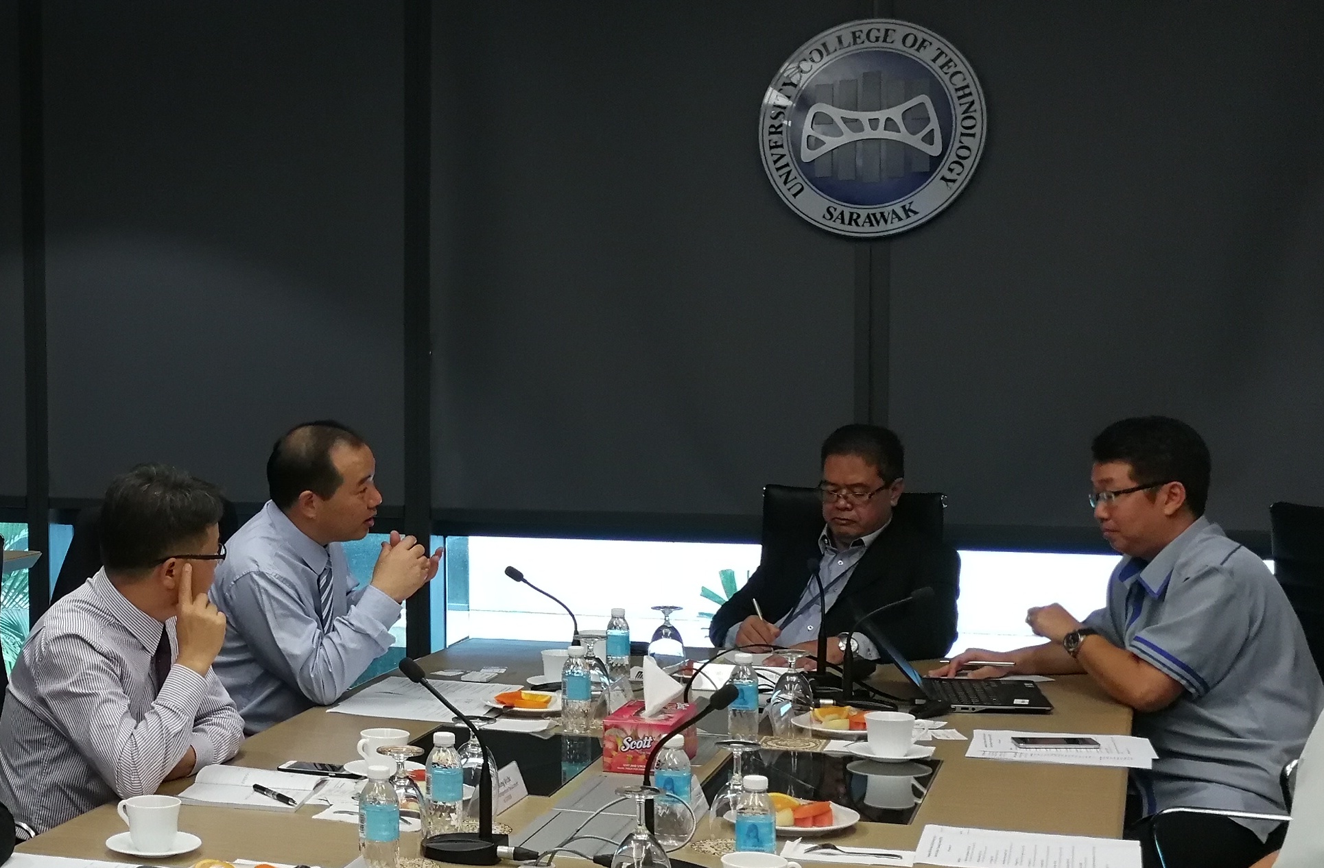 杜方敏校长(左2)与马来西亚砂拉越科技大学校长拿督阿布都•哈金教授(右2)洽谈共建科研团队开发区域资源