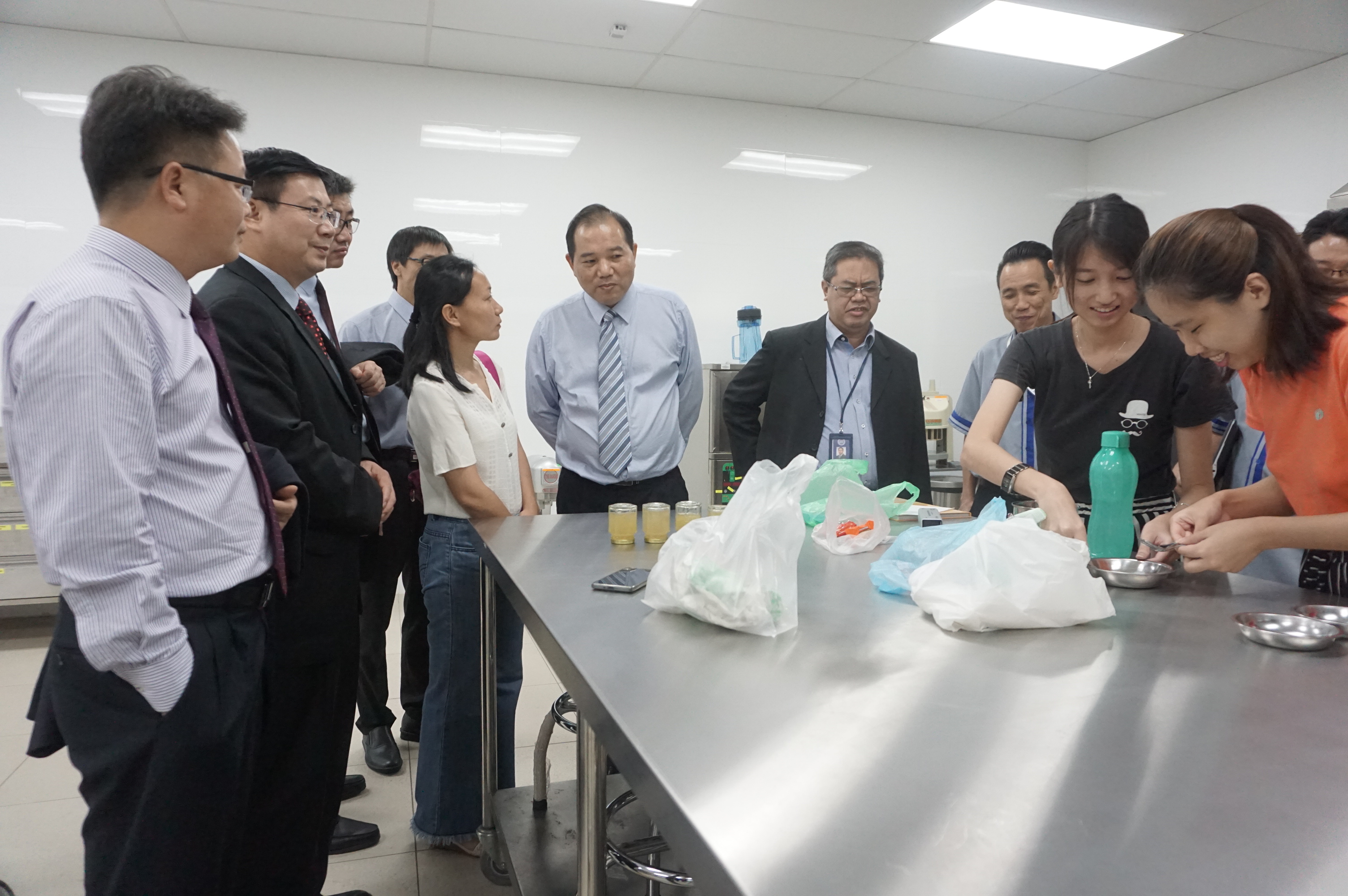 杜方敏校长(左4)鼓励我校毕慧敏教师(左3)在砂拉越科技大学校执教期间加大研发马来西亚特色食品