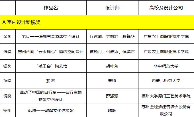 我校艺术系环境艺术设计专业2015级2班学生邱远威、钟妍舒、赖锋华的作品《宅寂——深圳有舍酒店空间设计》荣获新锐室内设计奖金奖,2015级1班学生黄晓丹、何雅冰、侯美君的作品《惠州西湖云水禅心酒店空间设计》荣获新锐室内设计奖银奖。指导教师徐慧宁副教授荣获最佳指导教师奖。