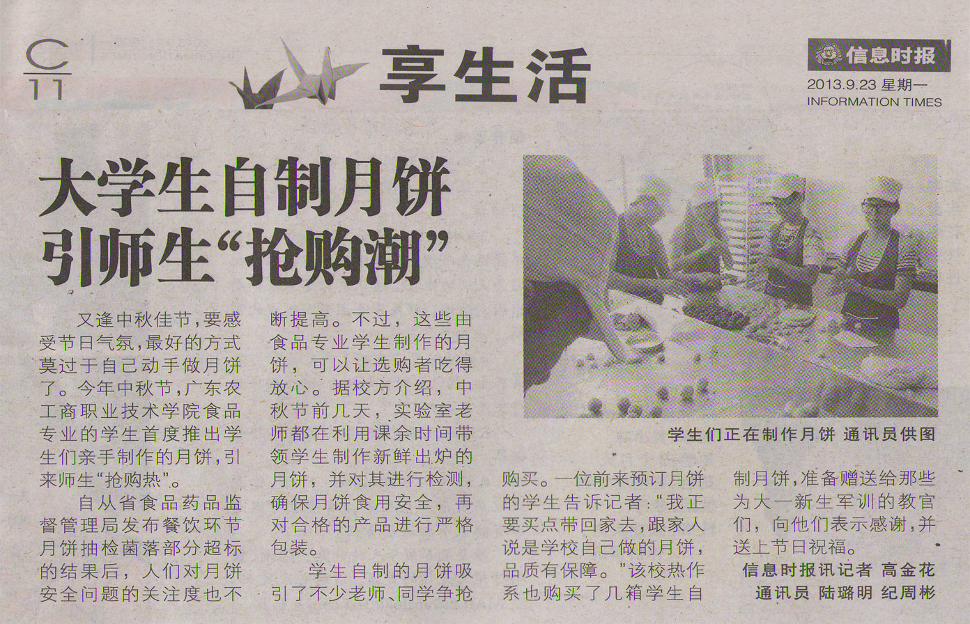 《信息时报》2013年9月23日在C11版以《大学生自制月饼引师生“抢购潮”》为题对我院学生在中秋佳节自制月饼售卖进行了报道。现将原文转载如下。