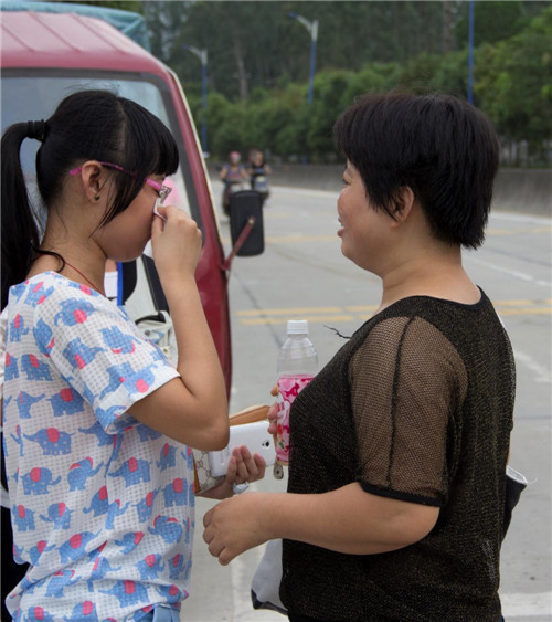 母女临别,母亲走向马路对面,向女儿挥手告别,泪水应声而落。