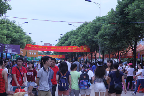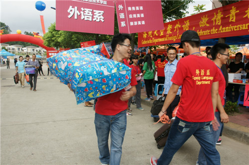“接过你的行李,我们就是农工商人,是一家人了。”被新生称为最Q小黄人的小刘驮着跟自己体型差不多庞大的行李包,笑嘻嘻对师妹说。一会儿,迎新各系的本营就挤满了新生的行李,停车场整齐排列着车辆,现场人声鼎沸。