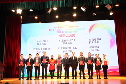 2017年12月22日上午,第三届“挑战杯——彩虹人生”广东职业院校创新创效创业大赛颁奖大会在我校粤垦路校区学术报告厅举行,团省委副书记武一婷,大赛组委会秘书长、团省委学校部部长廖庆春,学校部副部长许业河,我校党委书记杨群祥,党委副书记、副校长熊焰,纪委书记黄乃文,部分高职院校领导、团委书记,我校相关部门负责人,大赛指导教师、参赛选手参加本次大会。