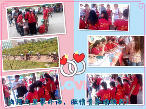 2014年9月13日星期六早上,学院迎接新生工作在办公楼前正式拉开帷幕。Gather in the Department of Foreign Languages, celebrate the Anniversary with passionate youth.“海阔天空聚外语,激情青春颂校庆”的标语在喜庆的校道上格外醒目!一大早,外语系主任蔡旻涛、各专业的辅导员亲临现场,统一指挥协调迎新工作。党支部成员、入党积极分子、学生会成员及志愿者也齐聚迎新现场,各就各位。