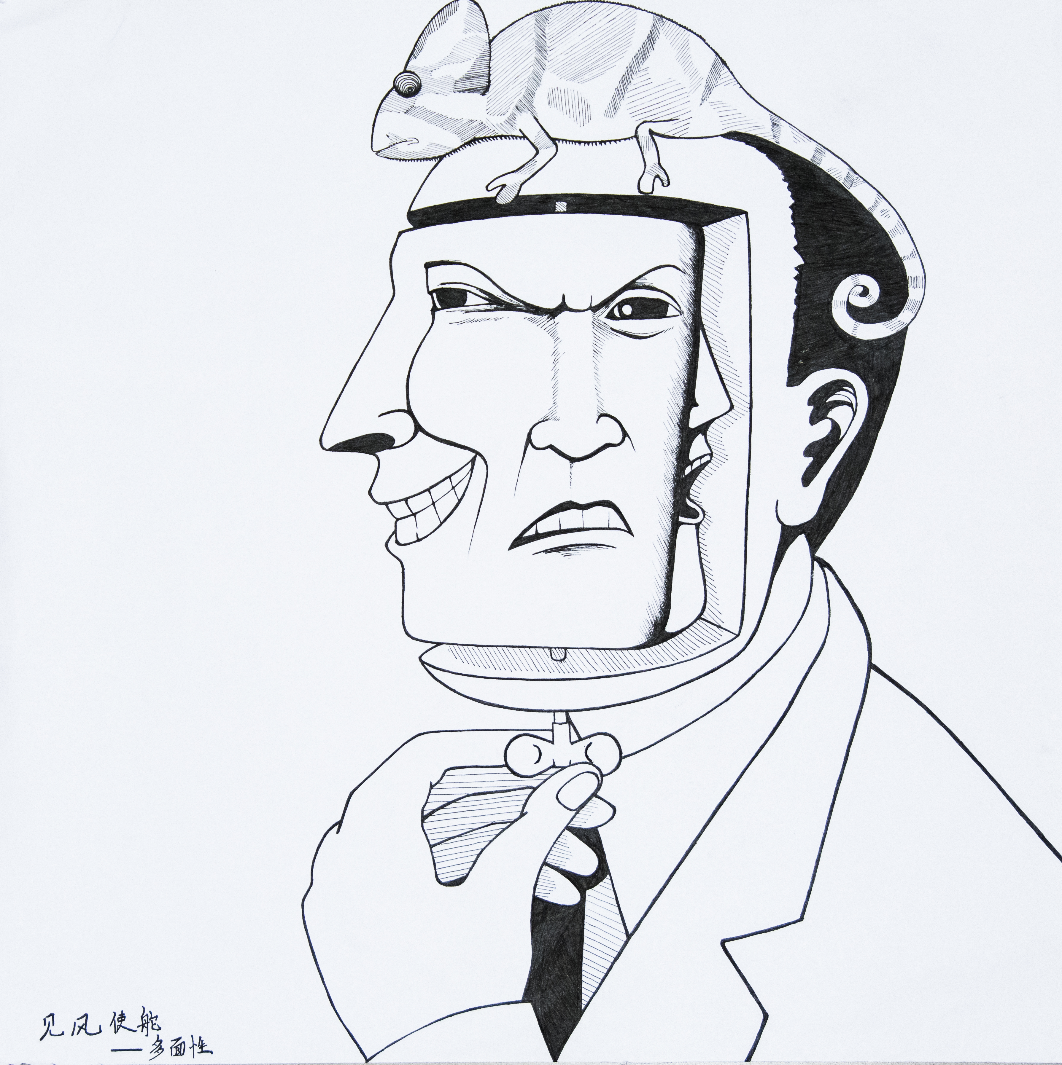 我的作品描绘的是人的多面性。大家知道,人的表情是一张体现人性的晴雨表,前一秒可能是阳光明媚,一眨眼以后就可能阴雨绵绵,前一秒是欢声笑语,一回头可以面目全非。这种人物的表情变化通常可以通过电视演员,在角色的表情变化中体现出来,这种角色通常是属于反面派的。而我的漫画中,画的是一个挺有绅士风度的人,其特点是他的脸部可以360度旋转,每一面都能经过旋转后在正面显示。而他的头颅上趴着一只变色龙,很安详到眼神却在环顾周围的风吹草动。一有什么情况就可以控制人旋转脸部,有一种"见风使舵"的感觉。可以说我的作品一方面是讽刺那些见风使舵具有多面性的人,他们像变色龙一样翻脸书,活得太累,也不容易相信他人,而人与人之间的交往不是应该多一些真诚,彼此相互信任么?因为只有这样才可以建立和谐有爱的人际关系!更重要的角度是,在体现人多面性的这些表情中,我把笑脸放在最上面,把其他面放在底下,也想说的是,即使人的心理具有复杂性和多面性,但是如果人人都调节好负性的那一面,把自己最好的一面展示出来,开心的笑,做好事,说好话,把自己的积极友爱传递给他人,营造出更具正能量的氛围,这样我们也才能活得更加幸福,我们的社会也将更加和谐!从这个角度来说也这体现了我们心理漫画大赛“幸福、和谐、健康”的主题。
