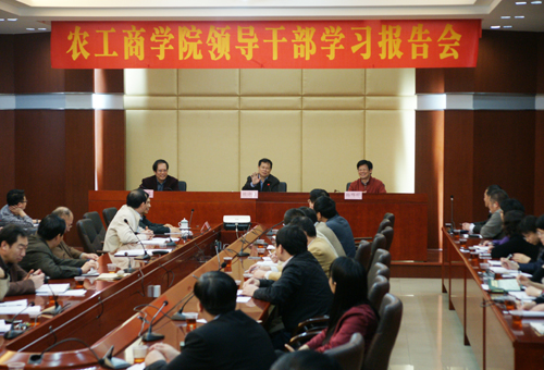 2012年3月7日下午4:00,“农工商学院领导干部学习报告会”在粤垦路校区教科楼中心会议室举行。广东省农垦总局党组书记、局长、省农垦集团公司董事长赖诗仁为学院中层以上干部作了题为《依托农垦,面向社会,办好学院》的报告,并与新一任领导干部进行集体谈话,亲切交心和沟通。杨群祥、黄伦生、杜方敏、何伟、罗南林、吕兆海等部门副职及独立科室正职以上干部参加报告会。