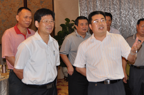杨群祥书记(前左1)听取阳江农垦局党组书记、局长李大胜(前左2)介绍阳江农垦情况