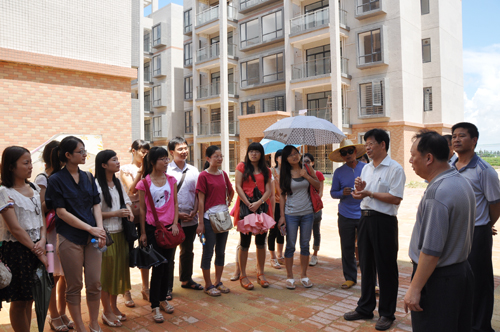 杨群祥书记(前右2)在阳江农垦平岗农场小城镇建设职工新居为新教师介绍农垦发展情况