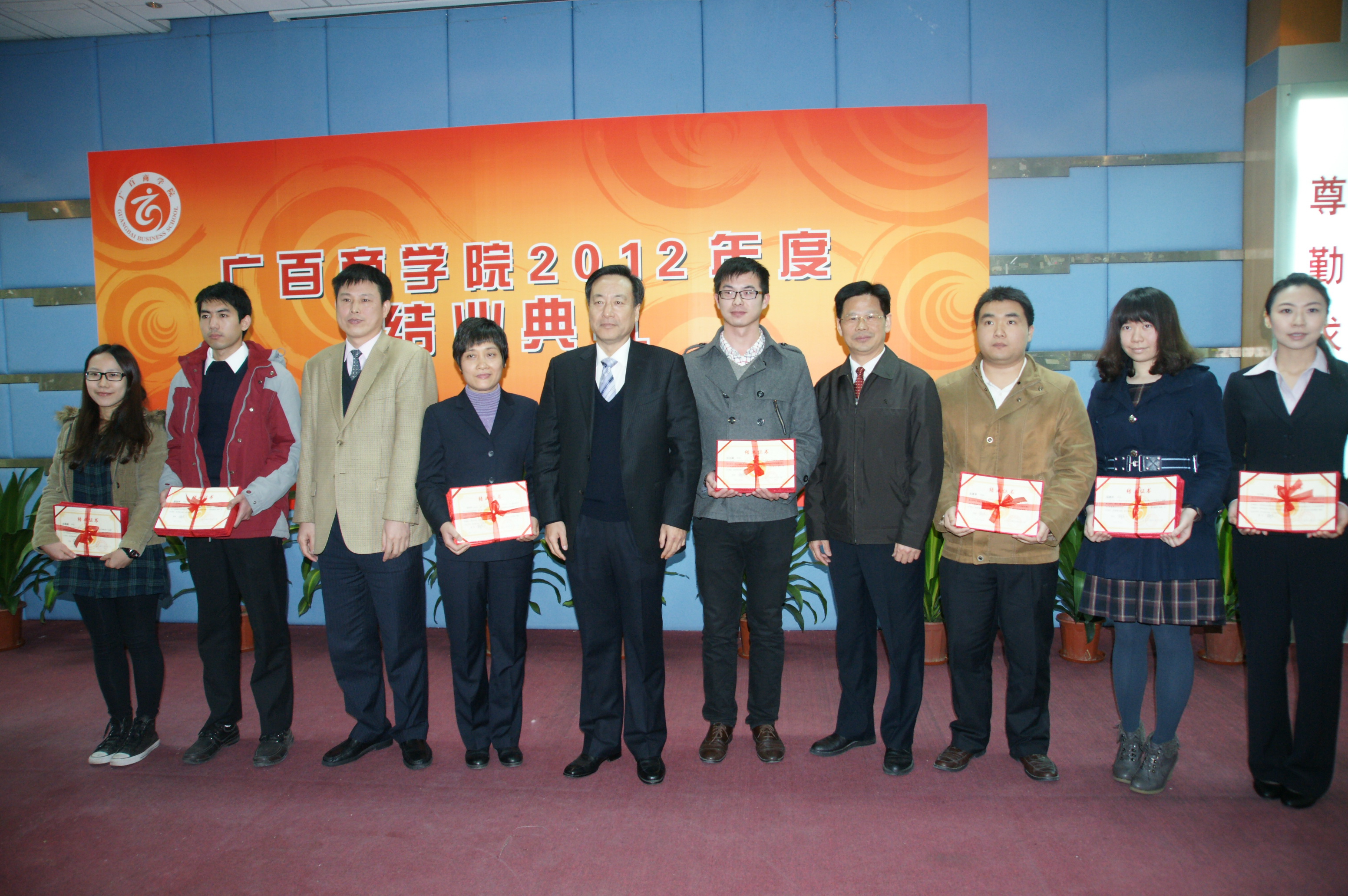2013年1月11日,广百商学院2012年度结业典礼在我院隆重举行。我院党委书记杨群祥,我院党委副书记、副院长、广百商学院副院长杜方敏,我院副院长何伟,广百集团董事长、党委书记、总经理、广百商学院院长荀振英,广百集团党委副书记、纪委书记曾郴湘,出席了结业典礼。结业典礼由广百集团副总经理、广百商学院院务委员潘建国主持。
