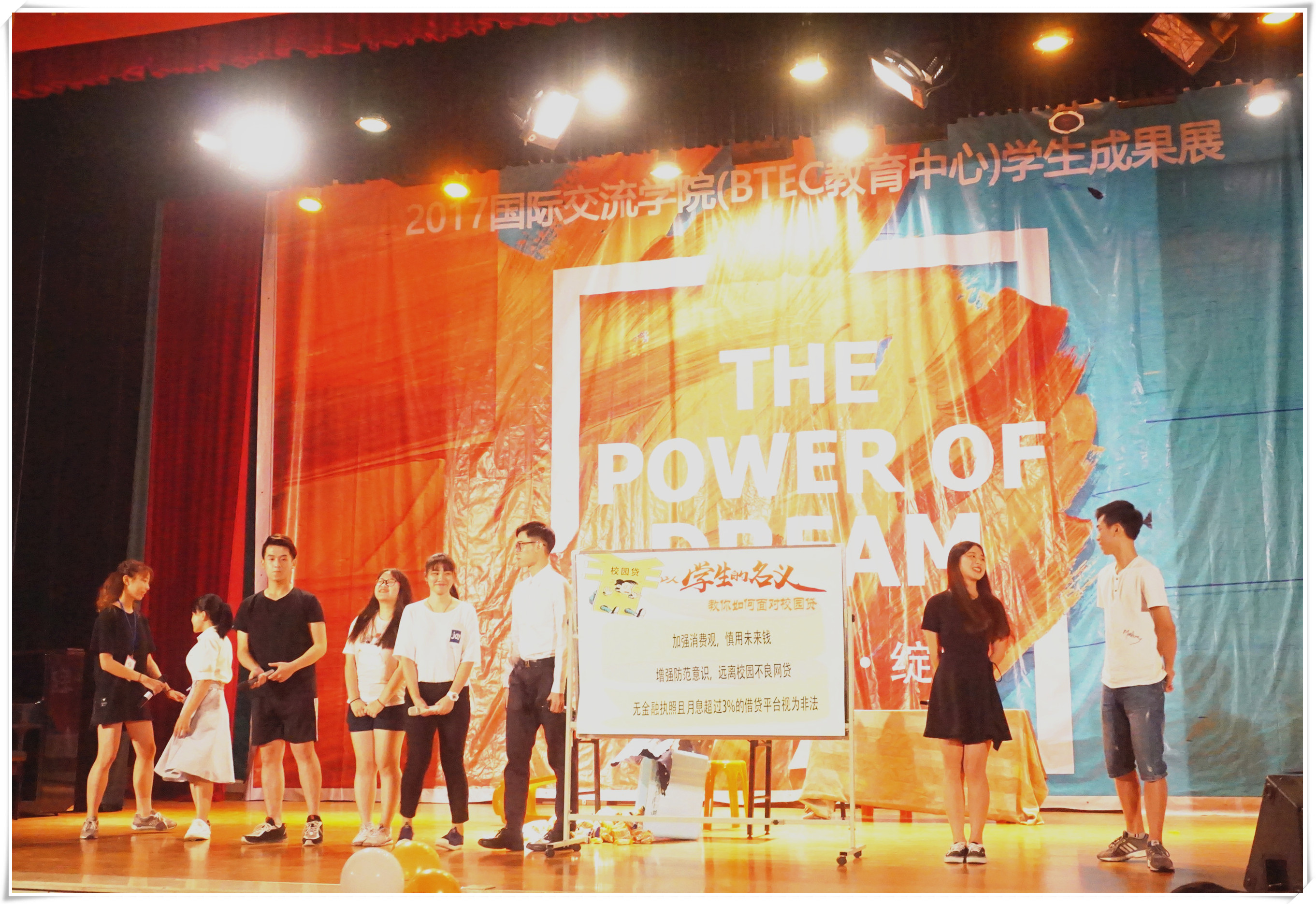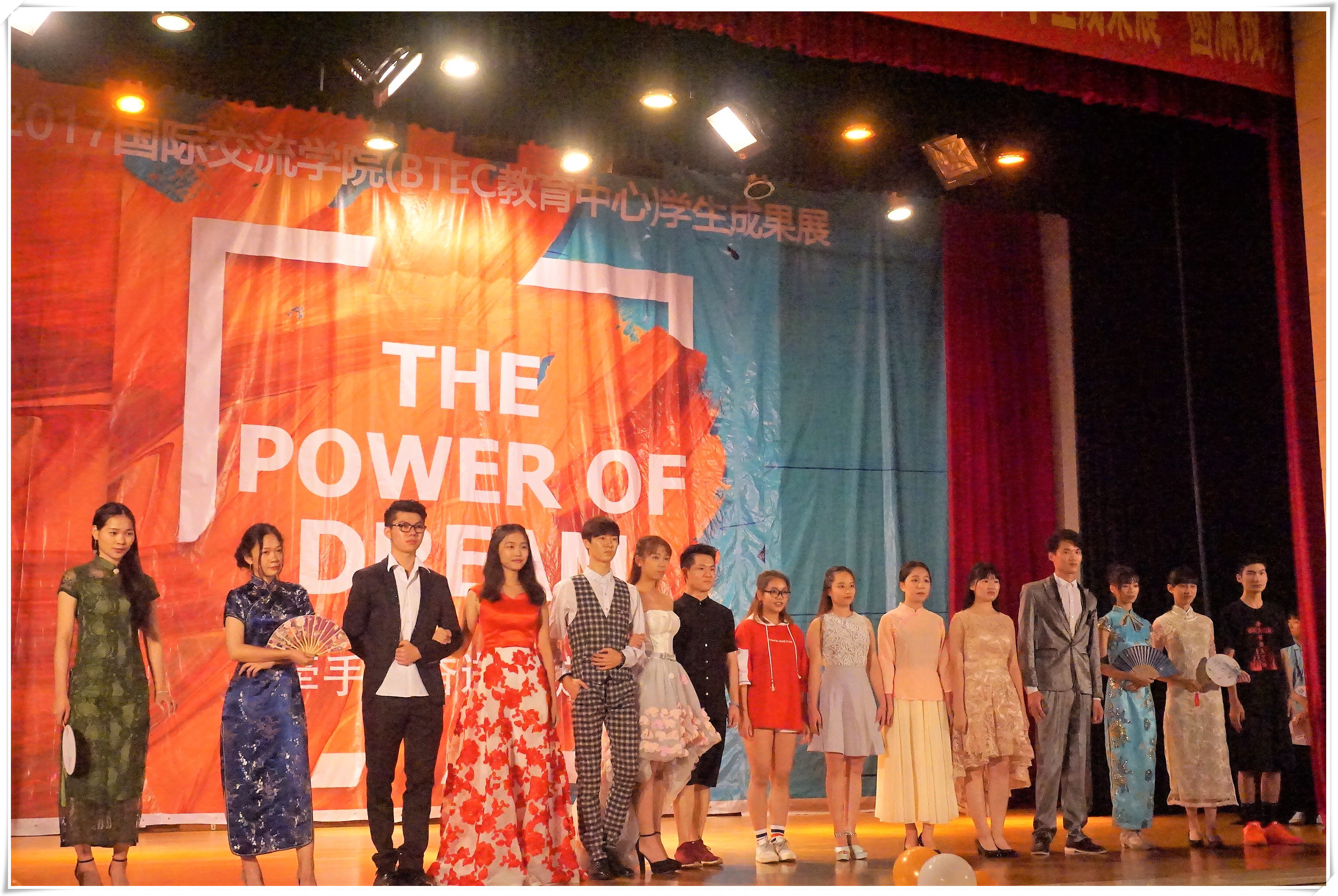 本次展演以“The Power of Dream( 梦想的力量) ”为题,通过“牵手、奋进、绽放”三大版块,展现了2016-2017学年BTEC学生精彩纷呈,富有成果的大学生活。在追逐梦想的路上,BTEC双语课堂、音乐社、戏剧社、羽毛球社、主持人队、舞蹈队、礼仪队、爱心联盟、宿舍文化节、职业拓展周、营销策划大赛、中国梦主题教育等学习和活动都留下了BTEC学生奋斗的身影。礼仪文化服装秀《别样青春》美轮美奂,传递了学生们对中西服装文化的感悟和理解;校园诚信小品《学生的名义》直击不良校园贷的风险隐患,号召全体同学自觉抵制,增进法律和安全意识;公益秀《时间都去哪了》展现了BTEC学生服务社会的爱心与行动力……