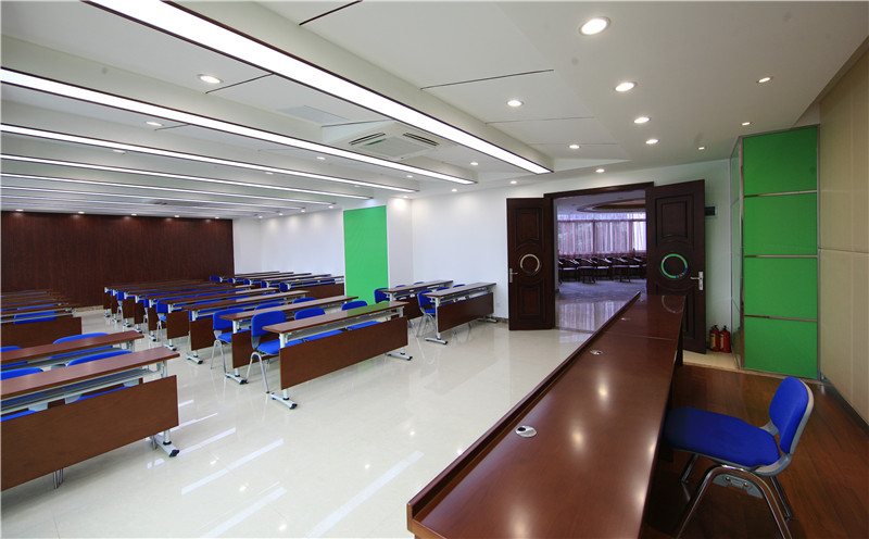 多媒体教室 ,位于培训楼二楼,面积103平方米,场地宽敞,采光度佳,可容纳培训班70多人。 配有高端音响设备、投影仪等多媒体设备,并配有中央空调。可召开课桌式、围桌式等多种培训会议。
