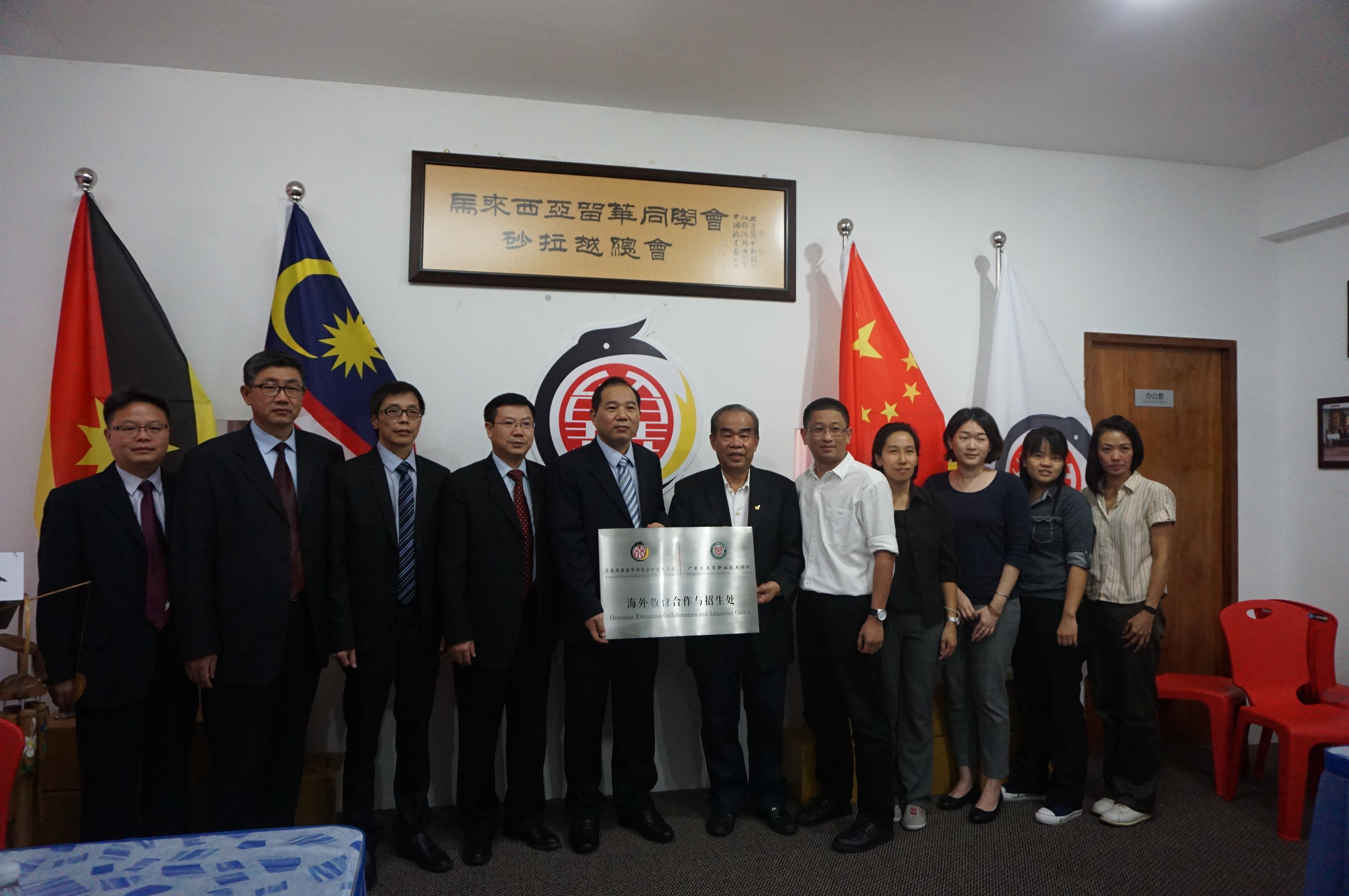 留华砂总会长拿督刘乃好(右6),署理会长黄首詠(右5),杜方敏(左5)共同为我校与马来西亚留华同学会砂拉越总会共建的“海外教育合作与招生处”揭牌