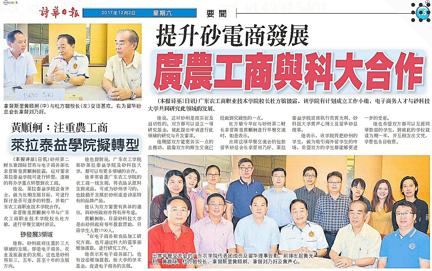 马来西亚砂拉越第二财政部长兼国际贸易及电子商务部长,莱拉泰益学院、砂拉越科技大学董事会主席,拿督斯里黄顺舸先生非常认同我校的合作思路,表示为了扩大莱拉泰益学院规模和提高办学实力,可逐步将办学重点转移到与农工商的合作项目上,拟给予莱拉泰益学院和砂拉越科技大学更多政策支持和资金资助。砂拉越科技大学校长拿督阿布都•哈金教授赞同我校提出的共建区域资源研究中心的建议,支持两校在学术、科研、社会服务等多领域开展更高层次和多样化的合作。马来西亚留华同学会砂拉越总会会长刘乃好拿督、署理会长黄首詠认为我校留学生招生项目将砂拉越华人子弟列为主要对象,给予优惠,是惠及华人子弟的好政策;我校先进的职教办学理念和专业优势能为砂拉越本地电子商务、农业、旅游三大支柱产业培育高素质的国际化人才。马来西亚《星洲日报》、《诗华日报》全程报道我校代表团的合作交流进展,并给予充分肯定。