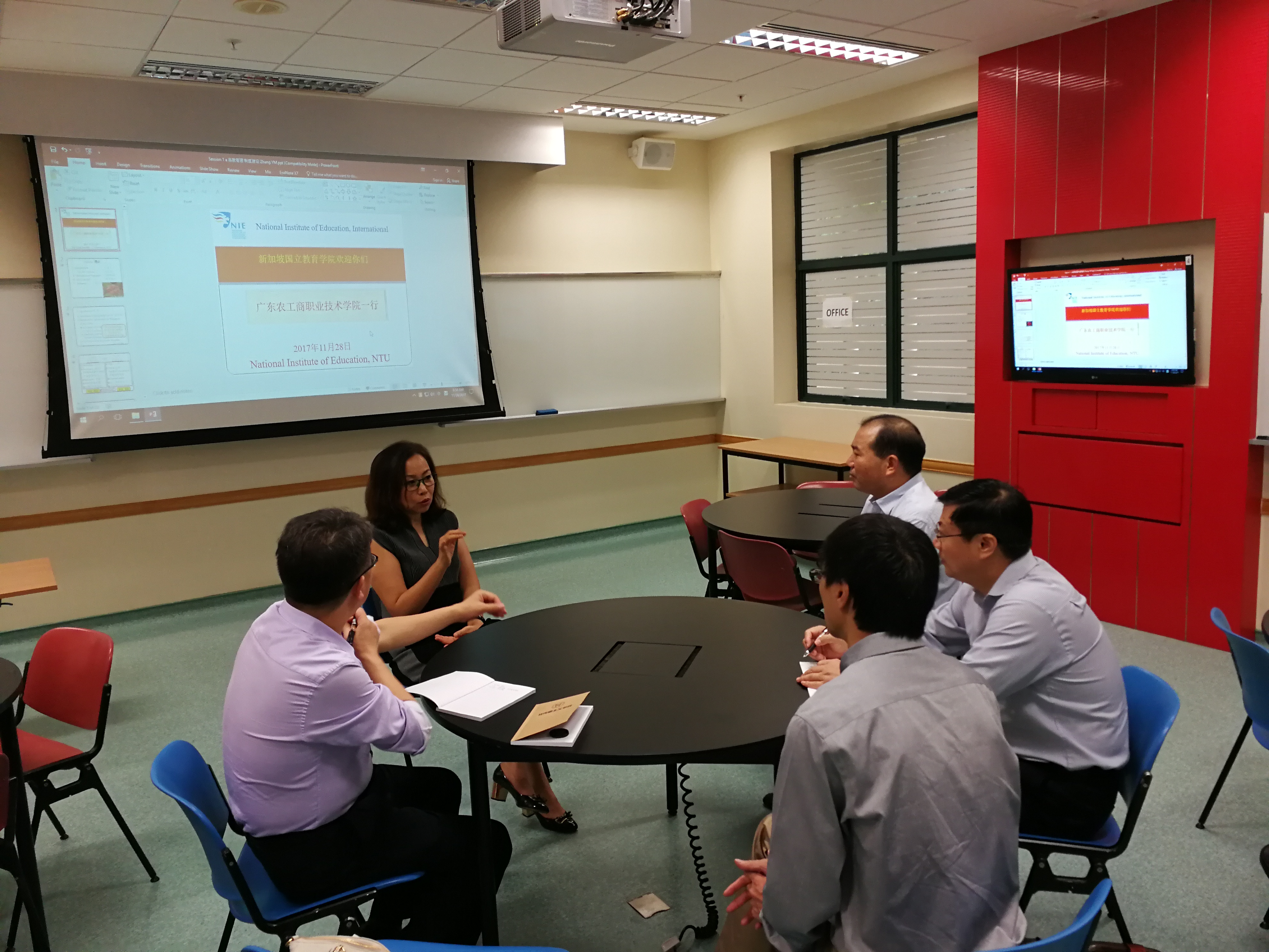 新加坡国立教育学院国际业务部中国项目主任孔丽娟(左2)与我校代表团杜方敏校长(右3)探讨职业教育人才培养理念与师资队伍建设