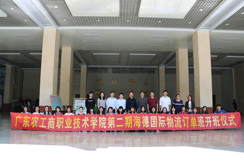 外语系主任蔡龙文首先致辞,对第一期与广州海德国际货运代理有限公司合作的订单班的成功举办和圆满毕业作小结,希望第二期订单班的同学们像第一期的同学一样,成功发展成为公司的优秀员工,并要求同学们保持农工商学生的优良作风,发扬艰苦奋斗、自强不息的农工商精神,完成企业的培训,积极参加工学实践。