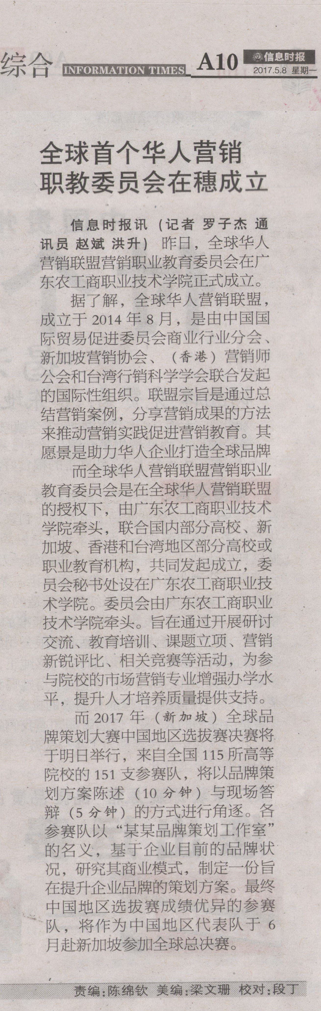 2017年5月8日,信息时报A10版以《全球首个华人营销职教委员会在穗成立》为题报道了我校承办执行全球营销品牌策划大赛与营销联盟职教委员会的相关事宜。现将有关事宜转载如下: