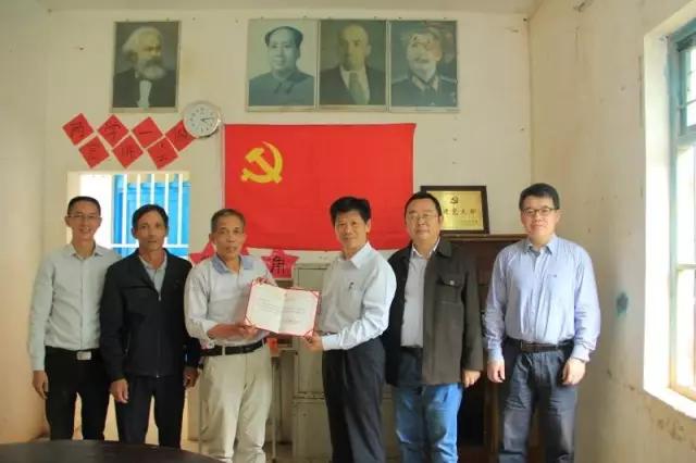 365bet真人网党委书记杨群祥(右三)向博袍村乡贤、扶贫志愿者邓堪连老师颁发荣誉证书。