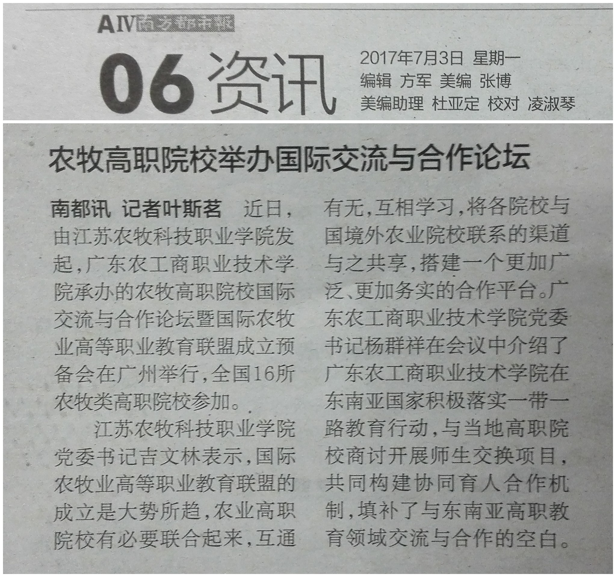2017年7月3日,南方都市报AIV06版以《农牧高职院校举办国际交流与合作论坛》为题报道了我校承办农牧高职院校国际交流与合作论坛相关事宜。现将有关报道转载如下: