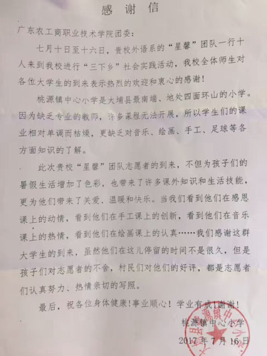 (梅州大埔县桃源镇中心小学致我校的感谢信)
