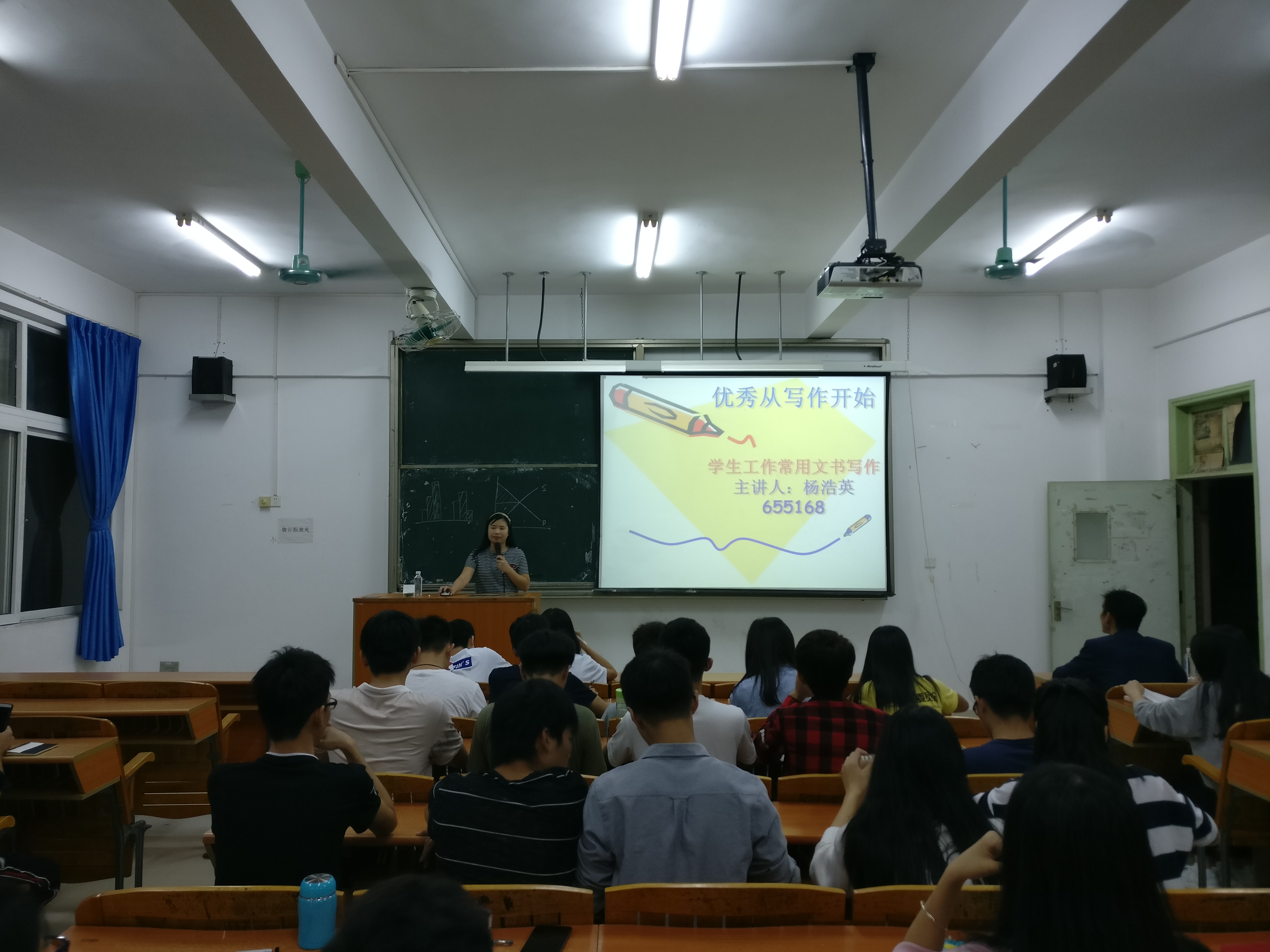 会议前,杨浩英老师表示九大组织是一个整体,并希望在场的每个人都记住这句话:“只有尝试才有出彩的机会,成功在于行动。”随后,杨浩英老师以“优秀从写作开始”为主题开始授课,接着,杨老师以《锤不破》的故事引出了文字表达的重要性;同时,围绕着写作的规范和常见应用文写作示例为话题展开详细的讲述。杨浩英老师精彩而全面的讲解,结合学生工作实际深入分析;生动、活跃的课堂氛围让同学们学到了许多以前没有注意和想不到的细节知识。最后,杨老师分享了“写作是思维的锻炼,思想的洗礼,思考的实现,更是成长的见证”来结束了授课。