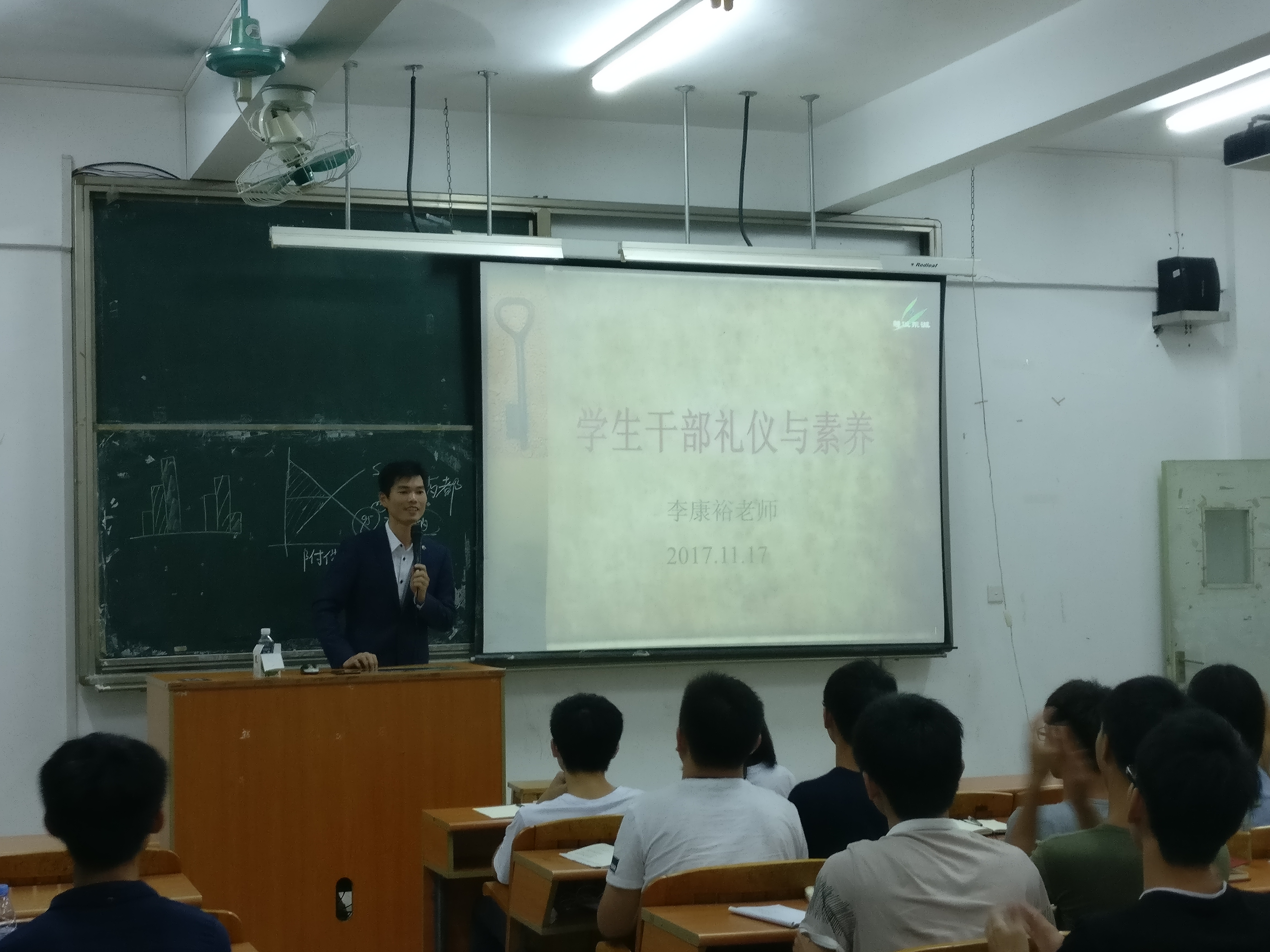 紧接着,学生党支部书记李康裕老师以鼓掌的正确方式为题,引出了授课的主题“学生干部礼仪与素养”。会议以“介绍礼仪、会议礼仪”两部分为话题展开,李老师用活跃的授课方式向同学们全面地介绍了各种礼仪知识——师生互动、同学们的演示,引起了学生们学习礼仪的兴趣,积极活跃的课堂氛围让学生骨干们深深地感受到礼仪的魅力与不凡之处。