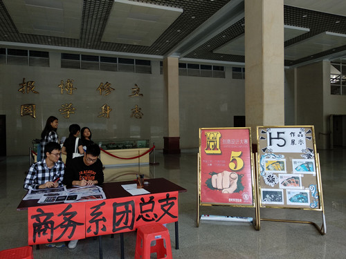11月6日,商务系团总支于教科楼一楼进行前期摆摊宣传活动。颜色鲜明的海报展板、创意十足的H5作品宣传单,吸引了许多学生驻足。两天的摆摊活动引起了同学们对H5的兴趣和关注,许多同学纷纷报名参加比赛,前期宣传取得很好的效果。11月15日,系团总支组织人员对作品进行初审,评分标准包括:封面整洁度、内容丰富度、色彩搭配度以及作品创意度、作品艺术度五个维度。经过评委的充分讨论,共有25份作品最终进入投票环节,这些作品由我系团总支微信公众号作为大众投票平台进行微信投票,最终前十名进入决赛。