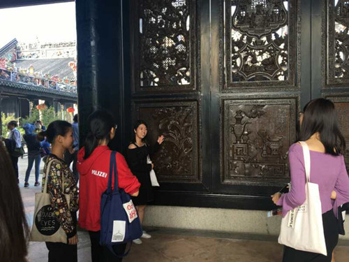 2017年11月10日,旅游英语2016级涉外导游1、2班的同学在任课老师刘志霞的带领下,前往陈家祠进行了《中国旅游地理与文化》课程的校外实践学习。本次学习的主题是针对“项目三 中国古建筑”的内容。在学习了基础理论的前提下,教师要求学生掌握陈家祠中的建筑工艺,包括砖雕、木雕、石雕、陶塑、灰塑、铁铸、彩绘等。现场教学中,老师首先带领同学们游览了陈家祠,讲解了主要游览线路和建筑工艺,并给出启发性的问题,接下来,学生分小组进行建筑工艺的观摩、研究、讲解。陈家祠内游客络绎不绝,有的学生在完成实践学习任务后,自告奋勇给游客进行了讲解,把学会的中国古建筑知识运用到导游工作中,让这些意外遇到的客人赞不绝口。现场实践教学能够让学生理论与实践相结合,不仅对建筑工艺有直观的了解,更能够锻炼现场讲解能力。
