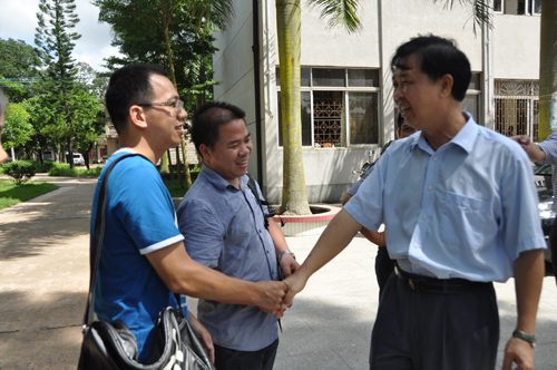 我院校友、茂名农垦局党组书记温维文(右1)鼓励在建设农场挂职锻炼的教师多为垦区作奉献