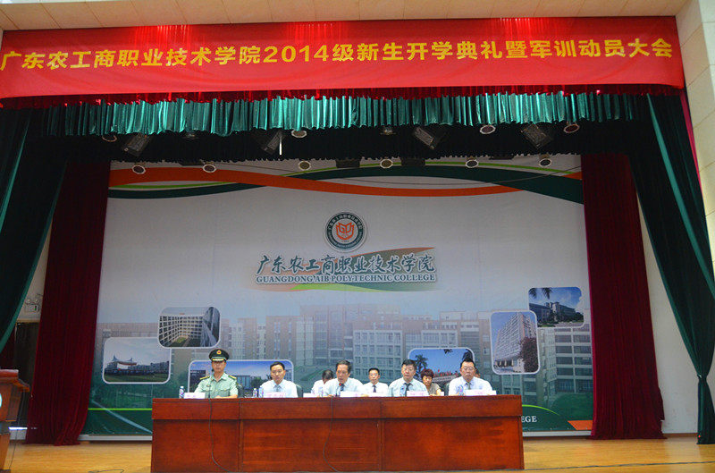2014年9月15日上午,我院在北校区和粤垦路校区召开2014级新生开学典礼暨军训动员大会。学院党委书记杨群祥、学院院长黄伦生、副院长何伟、罗南林、熊焰、吕兆海,广州市海珠区国防教育基地李春广主任,以及各系正职和处级行政部门负责人出席了开学典礼及军训动员大会。会上,黄院长代表学院作开学典礼致辞。