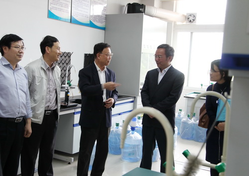 陶怀颖(右2)和陈少平(左2)听取杨群祥(右1)、杜方敏(左1)对学校发展概况的介绍