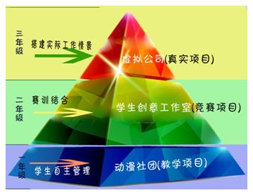 从专业设立之初,动漫设计与制作专业就积极开展各种教学改革,尝试专业“分段教学”、“赛训结合”、“学生社团”和“学生创意工作室”等多种形式的特色教学,形成了“三项融汇、分层递进、服务增值”的特色人才培养模式。在教学过程中,通过一系列的措施,为学生提供三课联动的的多途径教学,采用分层递进的管理模式,将‘教学项目’,‘竞赛项目’,‘真实项目’的分阶段循序渐进地融汇入教学,同时倡导服务增值。使学生在不断地学习中有效提升其专业核心能力,逐步积累各类项目经验,提高自己的职业素养,收到了很好的成效。